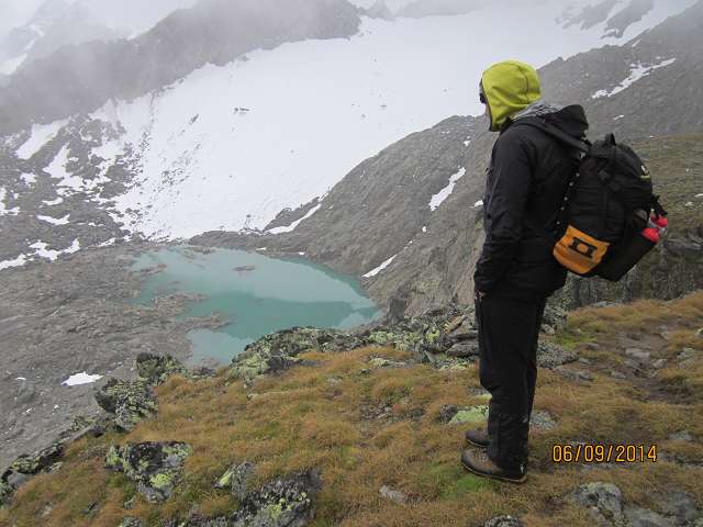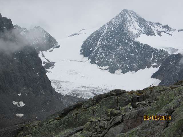 Das Wetter war nicht einzuschätzen, aber zumindest beim Abmarsch nieselte es nur leicht. 1,5 Stunden später, auf der Anhöhe vor dem Gletscher, dort, wo die Gebetsfahnen wehen, änderte sich das leider. Es begann stärker zu regnen. Unverdrossen nahmen wir unsere Regenjacken, zogen diese aber nicht ganz an, sondern ließen sie wie Capes, ohne die Hände in die Ärmel zu stecken, herunterhängen.