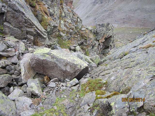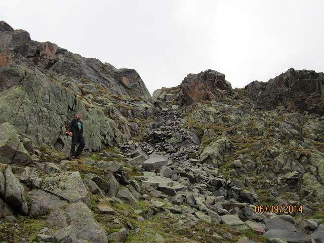 Wir verstiegen uns aber kurz, und mussten die Ersparnis in einen kurzen Rückaufstieg investieren. Der Umweg führte uns jedoch zu einem interessanten Abschnitt, einem Kamin, der schließlich zum Aufstiegsweg führte (aber zum dem rechten Ast, der aus unserer Tour nun eine schöne Runde machte).