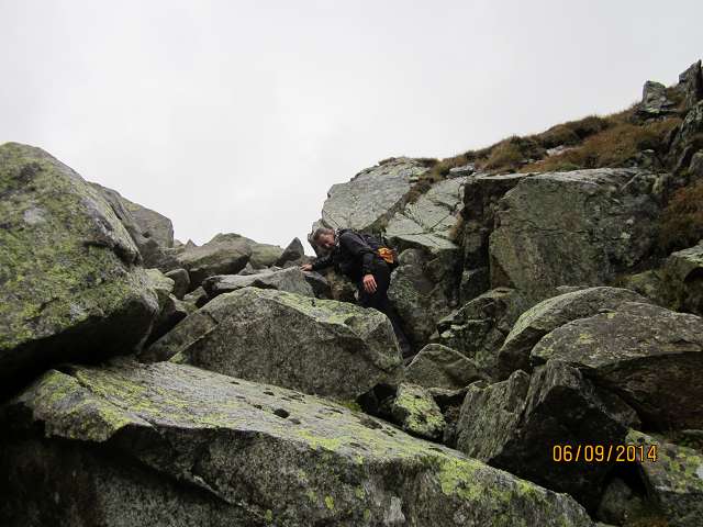 Der Höhenmesser zeigte 2.989 Meter an, das wäre schon über Gipfelhöhe gewesen, aber es schien nur mehr wieder bergab zu gehen. Der sich verziehende Gammel half uns: wir befanden uns auf einem Plateau, das tatsächlich mindestens Gipfelhöhe hatte, der Weg führte aber über eine kleine Scharte, wenige Meter unterhalb, wo dann auch die erwähnten Seilsicherungen auftauchten, wenn auch nur auf einer Länge von wenigen Metern.