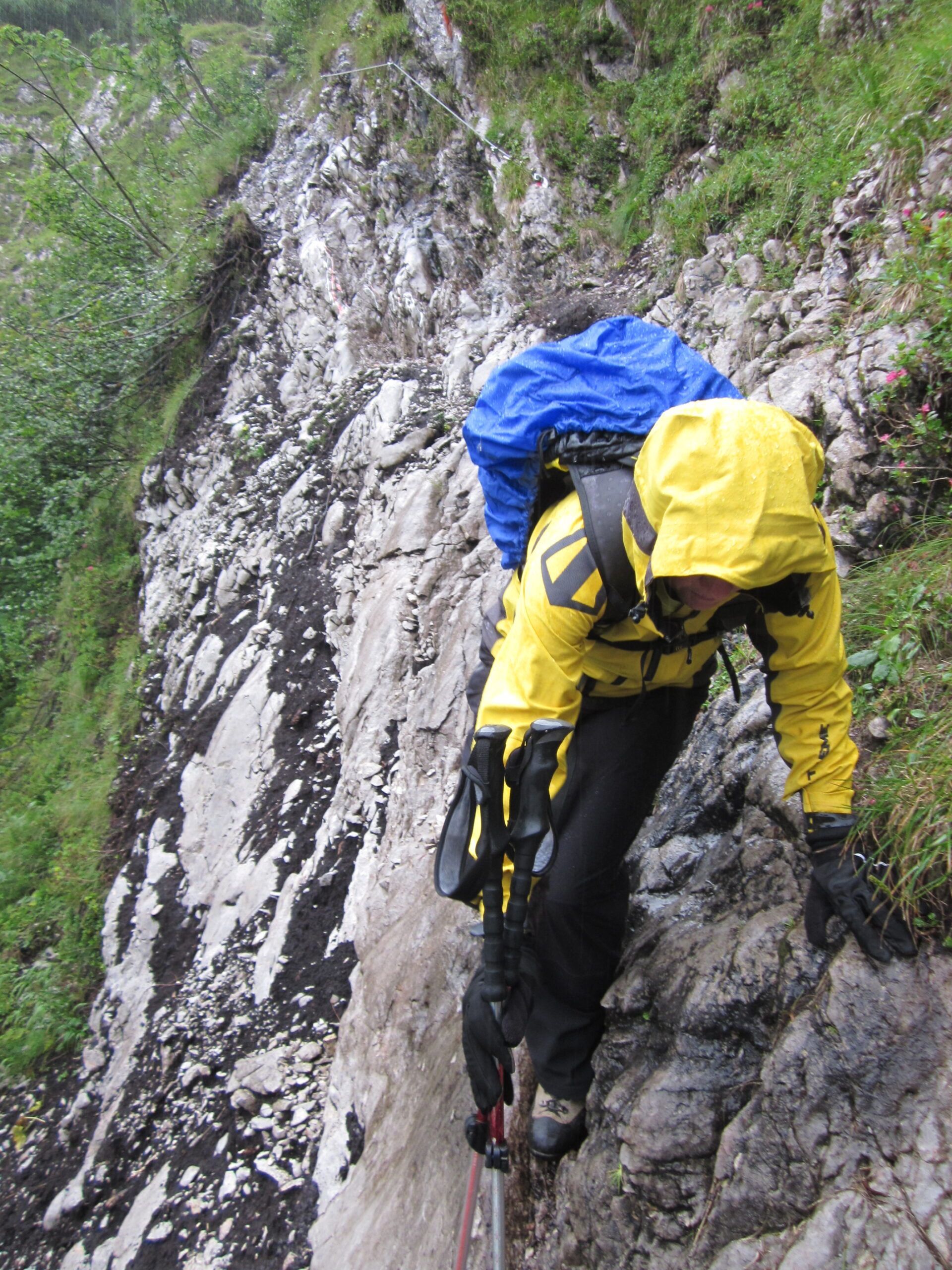 Dann setzte leichter, bald schon dichter Regen ein. Gut, dass wir optimale Regenklamotten hatten. Nicht so, das junge Franzosenpaar in Turnpatschen, die vor uns waren und wo vor allem sie sichtlich Probleme hatte, mit den ausgesetzten Wegpassagen. Nicht so mein Tinle! Es war bald geschafft, dass wir wieder beim Rifugio eintrudelten. Über Pause oder Einkehren wurde gar nicht erst gesprochen, wir watschelten gleich weiter. Dann kam uns der “Rifugio-Bus” entgegen. Im Kopf wurden sofort Pläne für neue Touren mit Bus-Hilfe gesponnen.