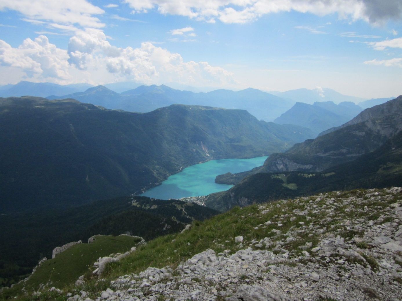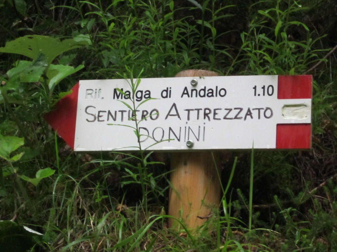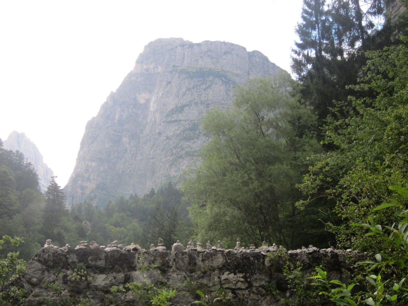 Ich gebe es zu, wir wollten (nun schon zum zweiten Mal), auf das Croz dell Altissimo (auf das “hohe Kreuz”). Zu eindrucksvoll ist die fast 1000 Meter hohe Wand, die vom Val delle Seghe aufragt, und auf deren Haupt die genannte Krone sitzt. Grundlage für die Wegfindung war die Kompass-Karte Nummer 73. Hoch mit der Bahn, wie vorgestern, zum Rifugio “La Montanara”. Von dort wollten wir ein Stückchen den Weg entlang gehen Richtung Rifugio Croz dell Altissimo. Bald sollten wir den (auf der Karte schwarz gepunkteten Pfad) erreichen und rechts abzweigen. So die Idee nach Kartenstudium. Aber der Abzweig kam nicht und kam nicht, stattdessen stiegen wir einige zig Meter ab und bald standen wir, ich befürchtete es, vor dem Rifugio Croz dell Altissimo.