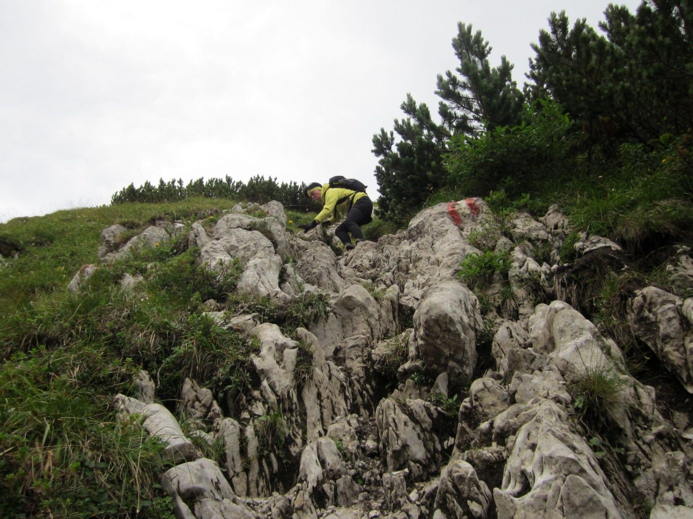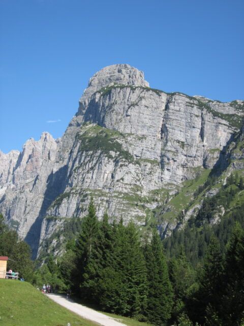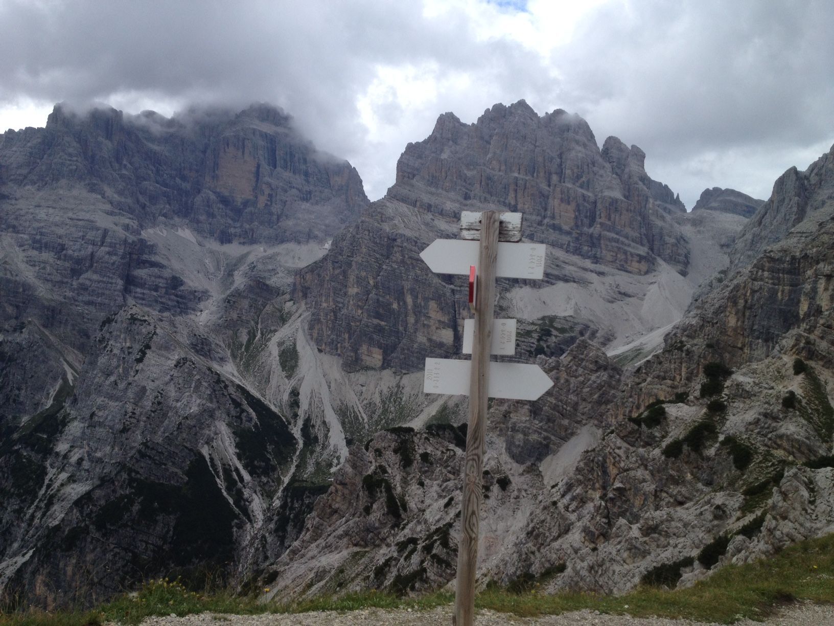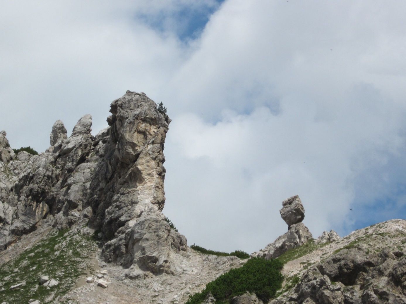 Hierher wanderten wir mit einer Heerschar an Halbschuhtouristen und ganzen Familien mit ihren Kinde. Ich musste schnell ein Stück weitergehen und meine Laune war kurzzeitig im Keller. Ich war nicht in der Lage, die Karte richtig zu lesen und fand den Abzweig nicht (der übrigens in der – wesentlich genaueren – Tabacco Karte Nr. 53 gar nicht eingezeichnet ist) und wir standen nun da, inmitten einer, typisch italienischen, laut quasselnden Menge an Touris. Ich zückte die Karte und wir beschlossen, den Berg “von hinten” zu ersteigen. Der “Passo del Clamer” war unser Zwischenziel. Der Weg dorthin entpuppte sich als gar nicht Ohne, oft sehr steil, manchmal mit kleinen Kraxeleinlagen.