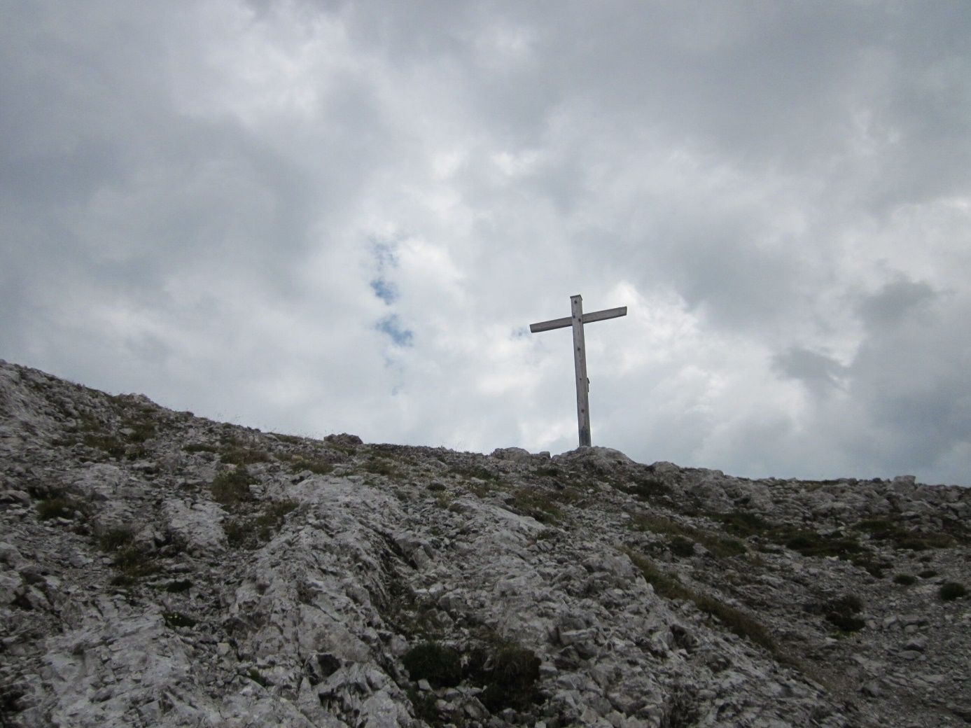 Nach etwa 10 Minuten konnte ich oben ein Kreuz erkennen. Da es kein angenehmes Gefühl bescherte, dass meine Partnerin alleine auf dem Sattel blieb, beschloss ich, genau dieses Kreuz anzusteuern und damit gut sein zu lassen. Ich ahnte natürlich, dass es NICHT das gewünschte “hohe” ist. Hoch war es allerdings, nämlich 2.459 Meter (und damit 120 mtr mehr als das “Croz”). Damit hatte ich fast 300 mtr ab dem Sattel und meiner wartenden zweiten Hälfte überwunden. Gebraucht habe ich dafür 31 Minuten. Natürlich pickte ich ein Label ins Gipfelbuch und erkannte, dass “mein” Kreuzerl nun das vom Cima dei Lasteri war, nicht das Croz dell Altissimo.