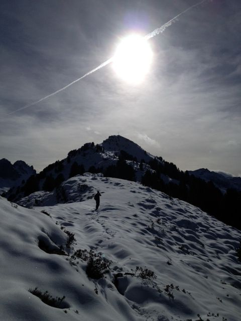 So trotten wir durch den Schnee am Kamm entlang nach Westen. Ein Viererschaft überholen wir und dürfen dafür die Spur neu anlegen. Herrlich. Die Unberührtheit als Erster genießen. In einer guten halben Stunde war das Werk vollbracht.
