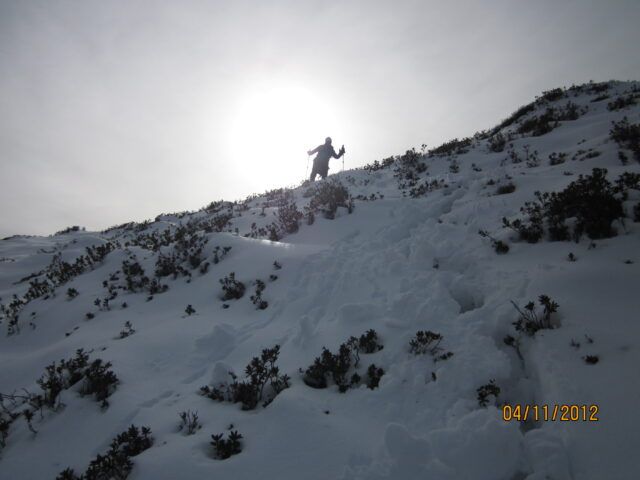 Die Überholten sind mittlerweile auch da und wir vermuten zuerst, dass sie weitergegangen sind. Bis uns, oh Graus, doch tatsächlich deren ekelhafter Gipfeltschickgestank erreichte. Jetzt war es für uns Zeit zum Gehen. Dafür sind wir nicht so weit herauf. Kurz vor dem Salfains See biege ich nach rechts ab, wir gehen dem Pfad, den man unter dem Schnee erkennt, entlang. Dieser endet jedoch und wir torkeln ein Steilstück der Extraklasse hinunter zum Aufstiegsweg. Juhuu! Wir sind ja gut ausgerüstet, also kein Problem.