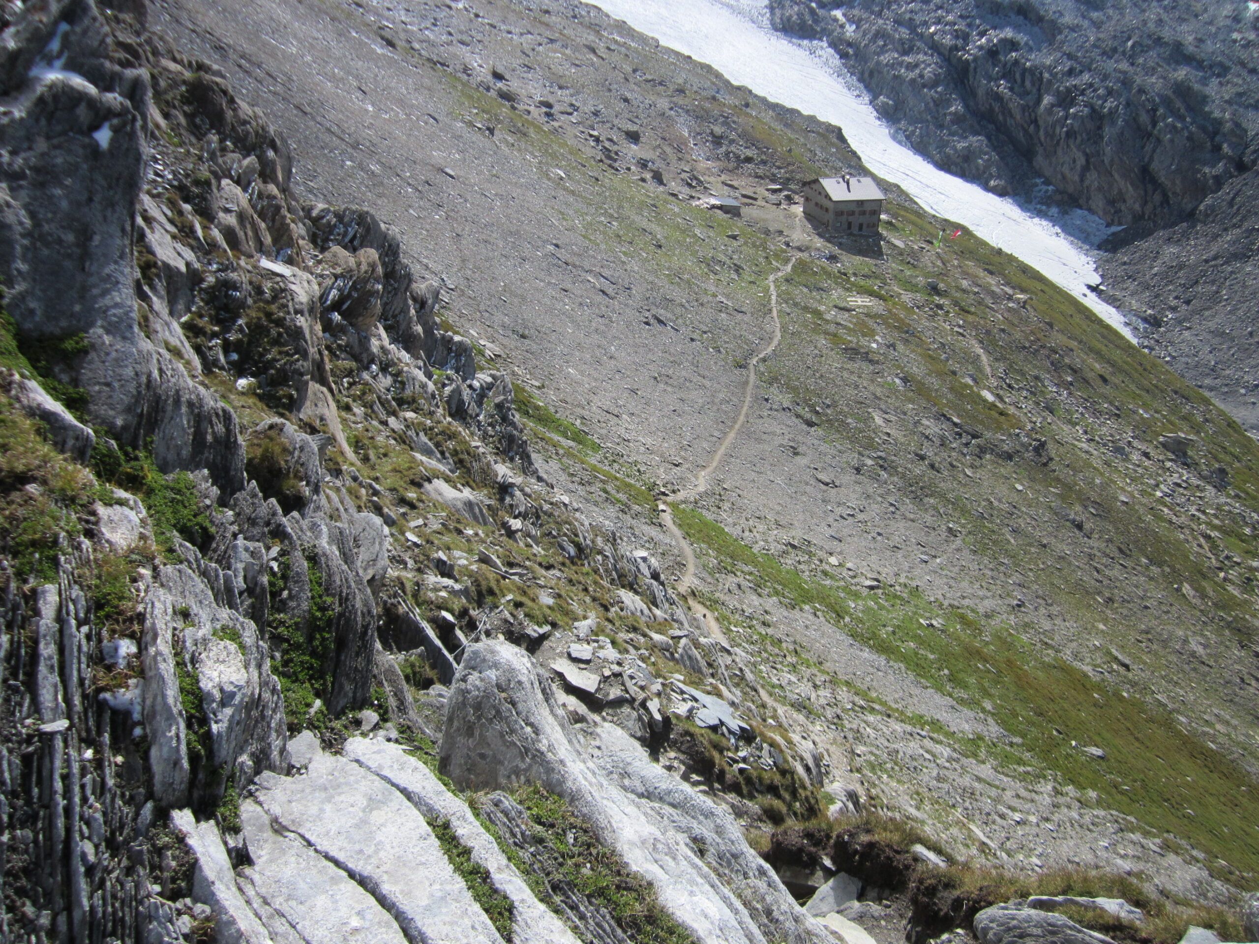 Die Schneepassage war gleich geschafft. Unten, beim Hund, fingen die 3 an, ihre Steigeisen abzuschnallen, während ich keine Zeit verlor, um weiter Meter Richtung Hütte zu machen.