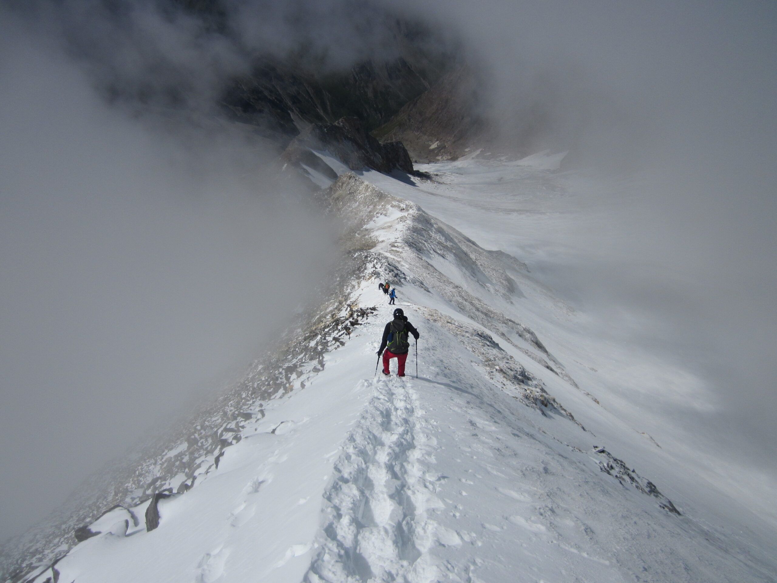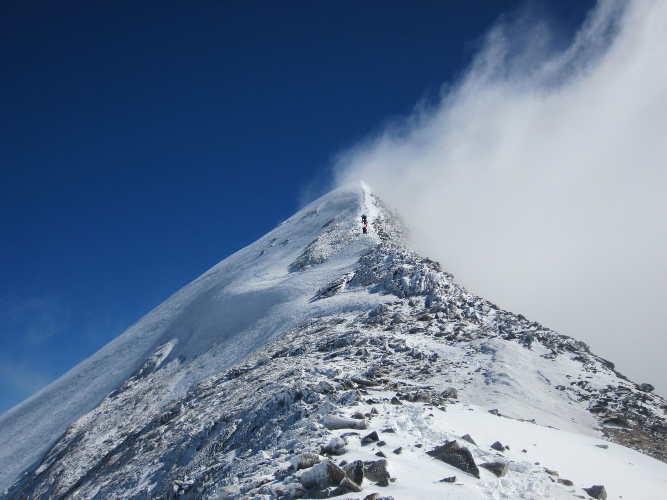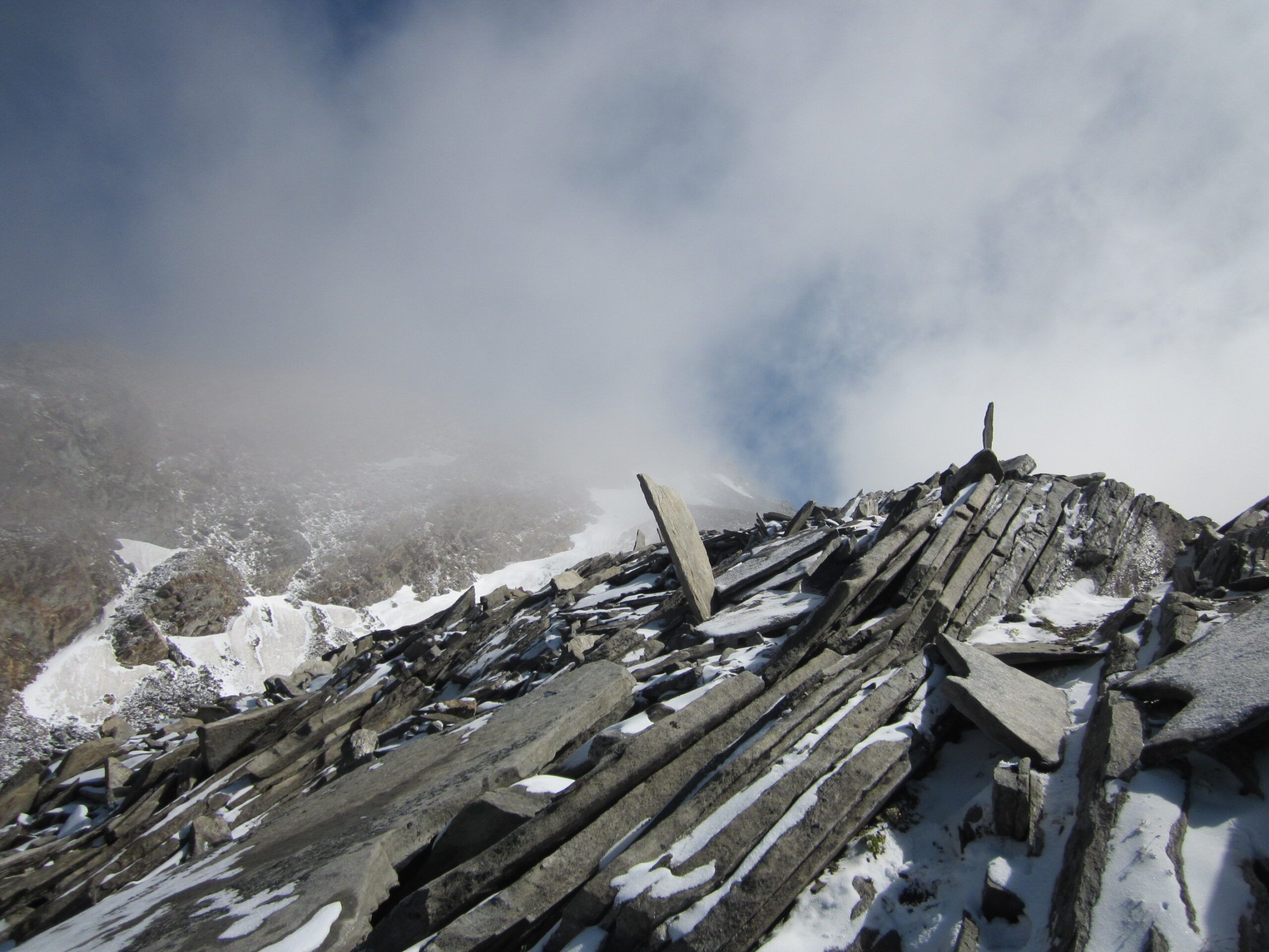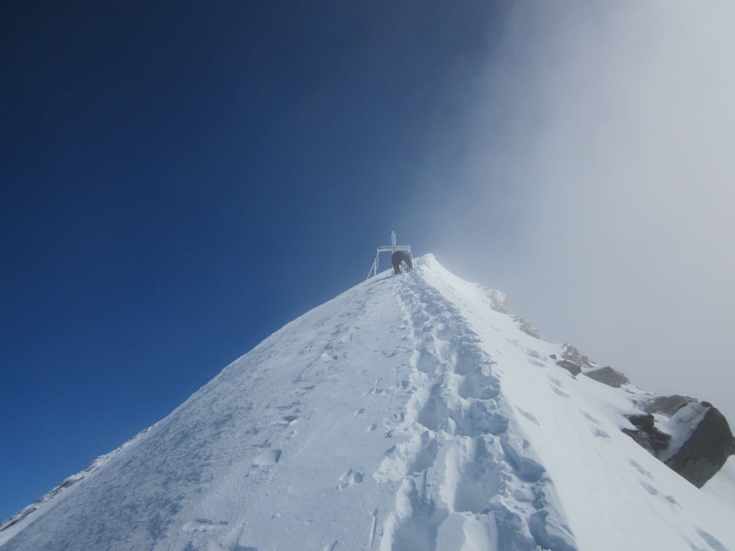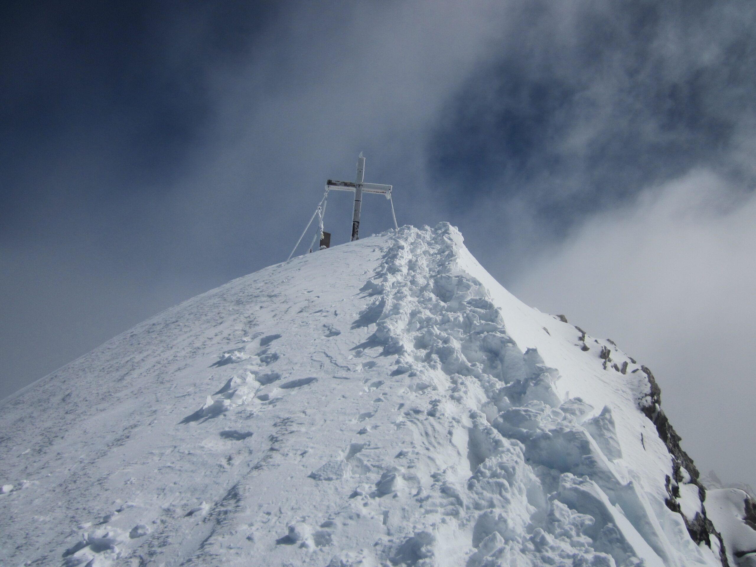 Unterhaltsam wurde es beim letzten Abschnitt zum Gipfel. Zuerst kamen mir zwei Tiroler entgegen, die etwas von “es ist eisig” redeten. Sie drehten um, es war ihnen nicht geheuer. Dann kam die berühmte Gipfelfirnflanke. Auf dem letzten ebenen Platz vor dem Finalaufstieg warteten zwei Lieblingsnachbarn und ein Hund. Dann kam mir ein Weiterer entgegen, der etwas von “ohne Steigeisen keine Chance….” faselte, und von zwei eisigen Schlüsselstellen (?). Ich sah von unten schon, dass es knöcheltiefe, gute Tritte gab. In der Nacht hat es geschneit und der eingewehte Pulver entschärfte den Firngrat, der sicherlich, wenn er knüppelhart ist, mit Vorsicht zu genießen wäre.