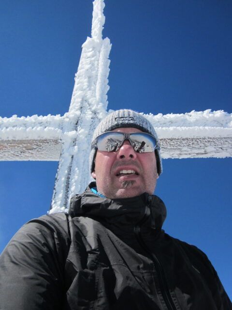 Gleich die Nächste, wieder rückwärts, die mich mit “und jetzt?” begrüßte. “Und jetzt….. gehe ich zum Gipfel” sagte ich, und stapfte 2 Schritte in den Tiefschnee, um dann wieder in die Spur zurückzukehren. Nach ein paar weiteren Schritten war ich oben. 3 Italiener machten sich abstiegsbereit, ich bediente den GPS-Track, machte ein Gipfelfoto und musste auch den Itakern bestätigen, dass ich nicht kalt hatte, in meiner Shorty.