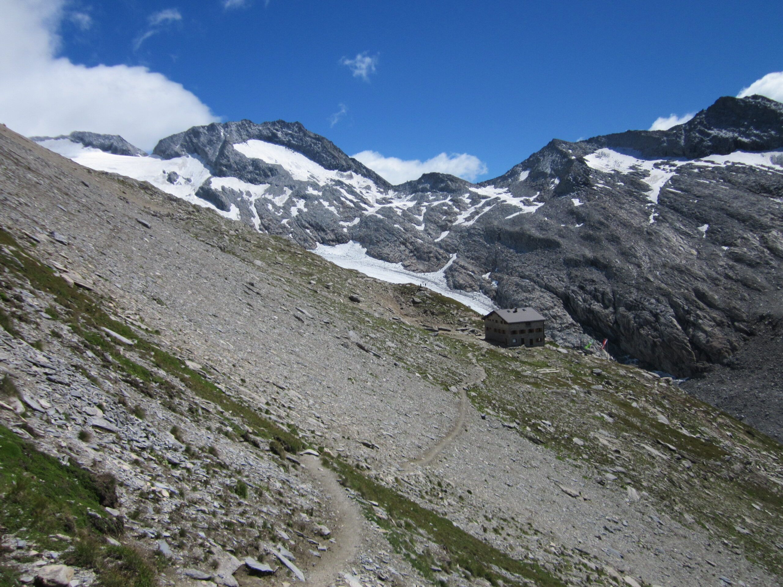 Den ersten Gefallen des Tages tat ich mir selber mit der (auch von anderen geforderten) Pünktlichkeit. Um 07.30 Uhr wollte ich bei der Kehre 3 zum Pfitscherjoch aufbrechen, naja, 07:24 Uhr war es halt. Toleranz muss auch sein. Nennenswerte Pausen machte ich keine, gemütlich trabte ich am direkten Weg nach oben. Die Hochfeilerhütte wollte ich am  Heimweg besuchen und etwas essen. Bald war das Rifugio (wir sind ja in Italien)  in Sicht und ich wanderte zufrieden mit mir selbst, stetig dahin und daran vorbei.