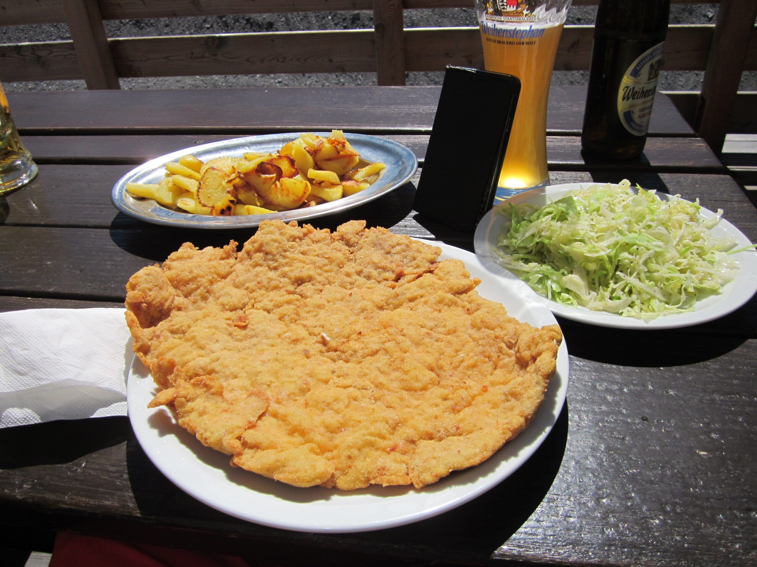 Diese erreichte ich um 13:00 Uhr – das war das erste mal, dass ich auf die Uhr schaute und ich freute mich, dass ich so gut in der Zeit lag. Der Wirt wollte mich dann mit dem Schnitzel herausfordern (siehe Foto, Handy als Größenvergleich). Diese Challenge nahm ich an und habe gewonnen 🙂 .