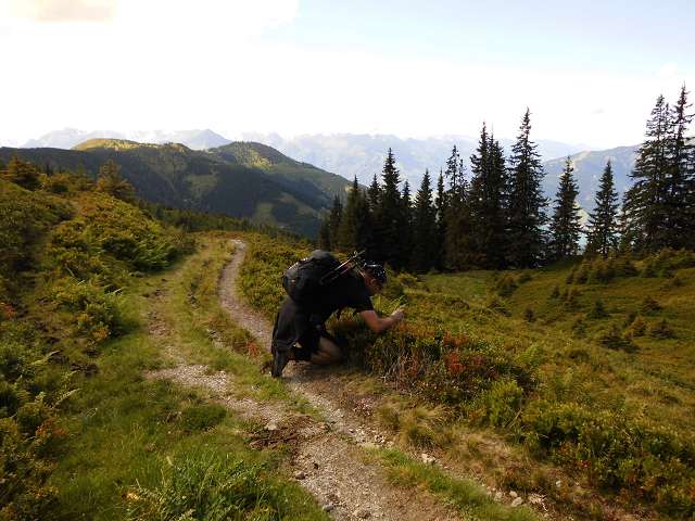 Eine freundliche Einheimische kralte einen Abschneider hinauf und kam mit 4 wunderschönen Steinpilzen auf den Weg zurück. Solche schönen Pilze anschauen, mein Herz klopfte freudig. Danach, oberhalb der Waldgrenze, wanderten wir durch volle Schwarzbeerfelder, so viele Früchte habe ich daheim lange nicht mehr gesehen.