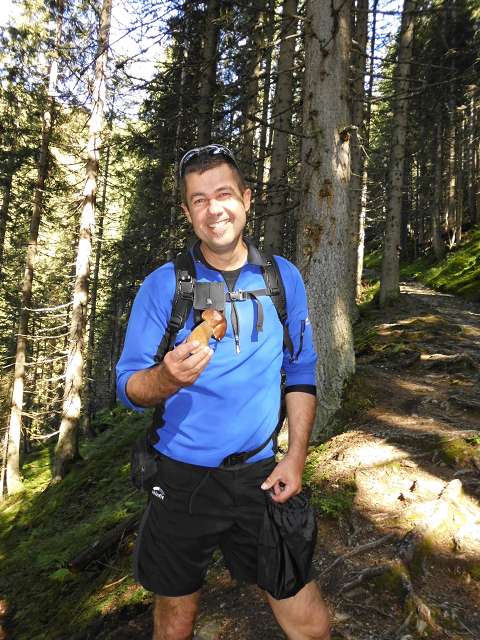 Am Weg ins Tal führte eine “Hilliabkürzung” fast zum Motivationszusammenbruch meiner MarTina, aber, sie selber half uns durch einen kurzen Gegenaufstieg auf den richtigen Weg zurück. Wir passierten wieder die Beerenlichtung und kamen in den Wald zurück, da, wo die Einheimische die Pilze fand. Ich musste natürlich dort hinab. Leider haben alle “Vorklauber” nicht mehr viel, aber immerhin noch einen schönen Steinpilz übrig gelassen.