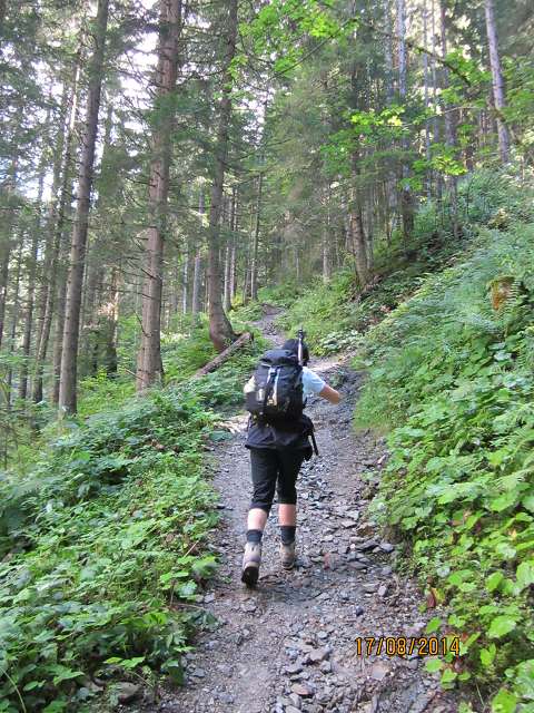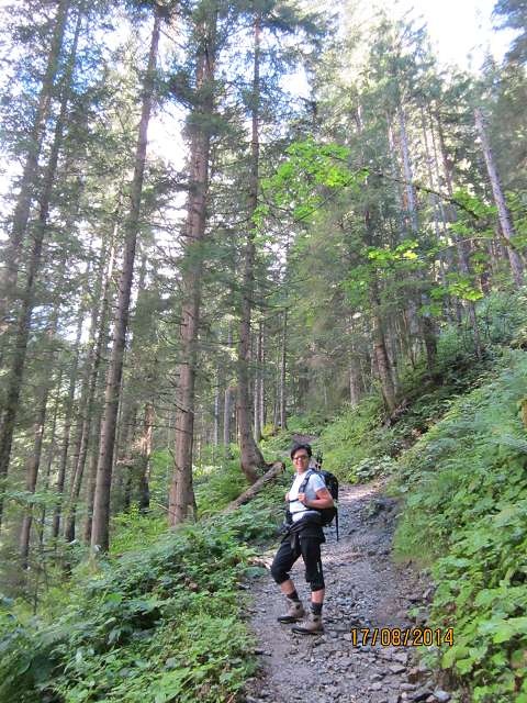 Wurscht, wir drehten alsbald um und fanden die richtige Strasse. Krankenhaus, bissi weiter, links hinauf, genau wie aus der Karte abgeschaut. Oben, am Ende der Straße, schnappten wir uns den letzten Parkplatz und marschierten los. 3 Stunden soll unser Ziel entfernt gewesen sein, die Zeitangabe war realistisch, erfuhren wir später. Zuerst führte die Route durch kühlen, feuchten Wald, dann durch eine Lichtung und abermals in dichtes Grün.