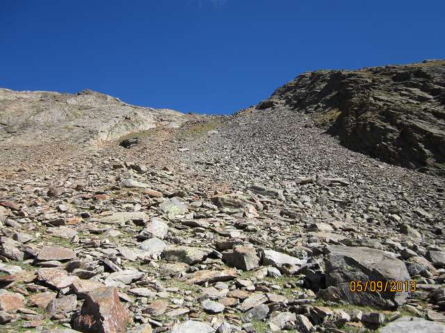 Weiter gings auf Schusters Rappen, mal auf einem schmalen Steig, dann wieder weglos. Der Zustieg zum Räuhengrat ist steil und ich machte schnell Meter. Der letzte Aufschwung ist dann ziemlich mühsam, annähernd ohne Trittspuren geht es über wildes Geröll und sandige Passagen.