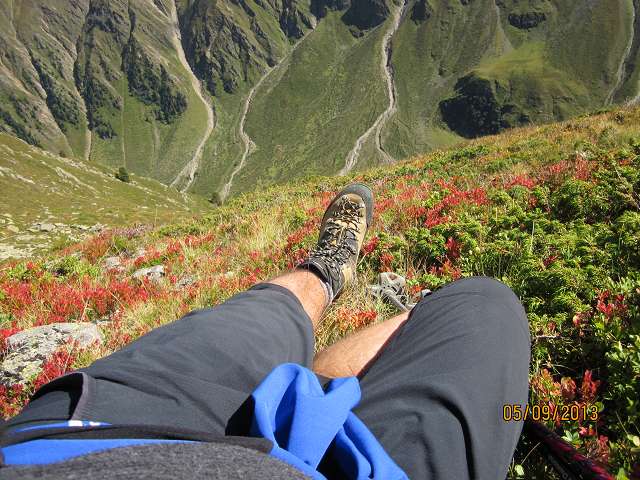 Drüben stärkte ich mich und suchte mir für den Abstieg die lockergerölligen, kieseligen Bereiche, die ein feines Abfahren erlaubten. Unten weiter legte ich mich ins Gras und rupfte die Schwarzbeeren um mich ab. Herrlich.