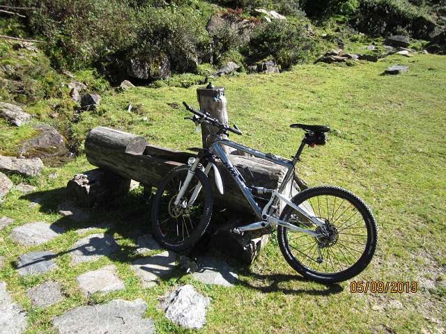 Im Nu war ich beim Bach, überquerte ihn  und hüpfte gut gelaunt die letzten Meter zu meinem KTM. Die Wasserflasche war leer, der Brunnen beim Rad kam nur recht.
