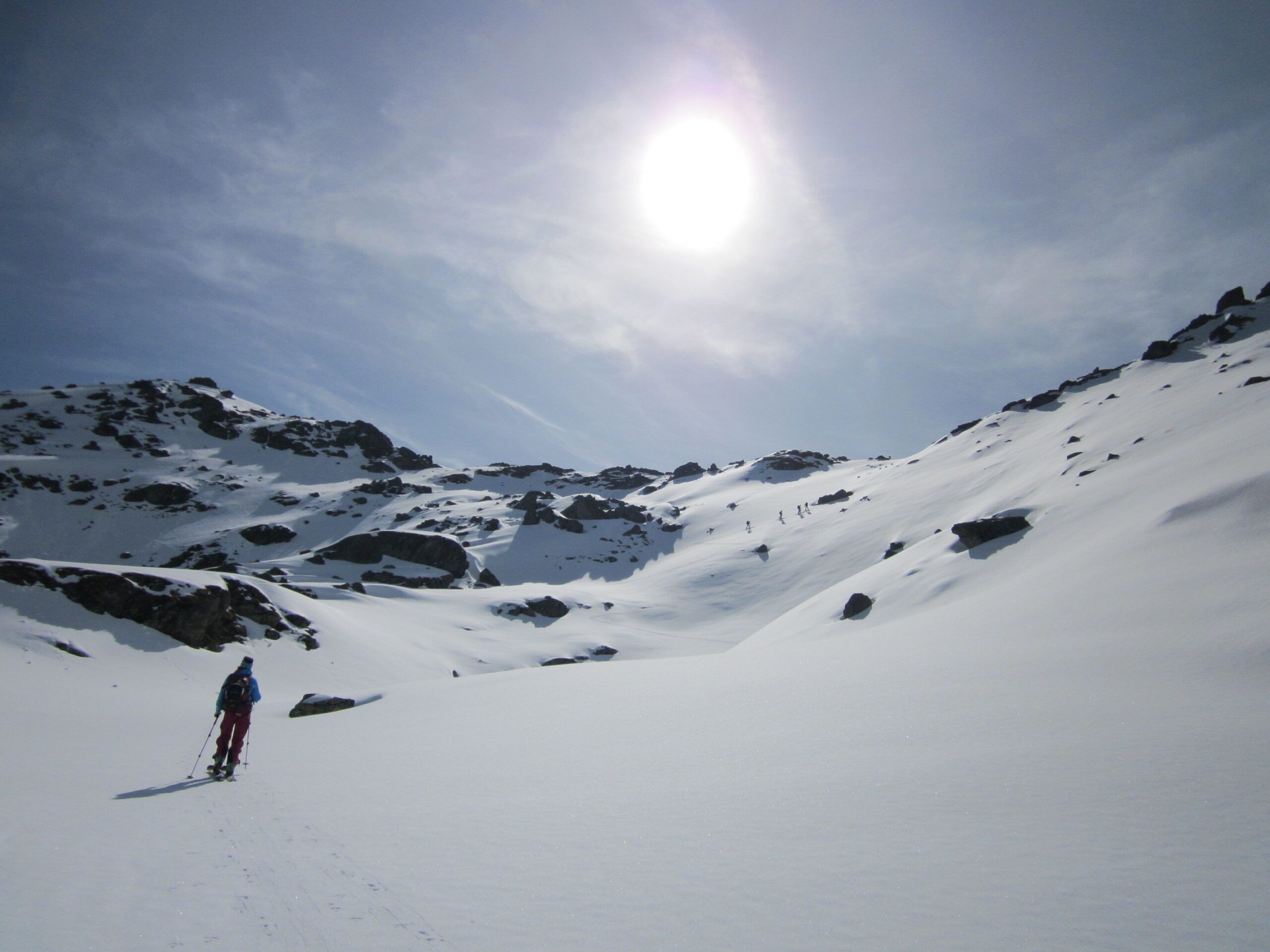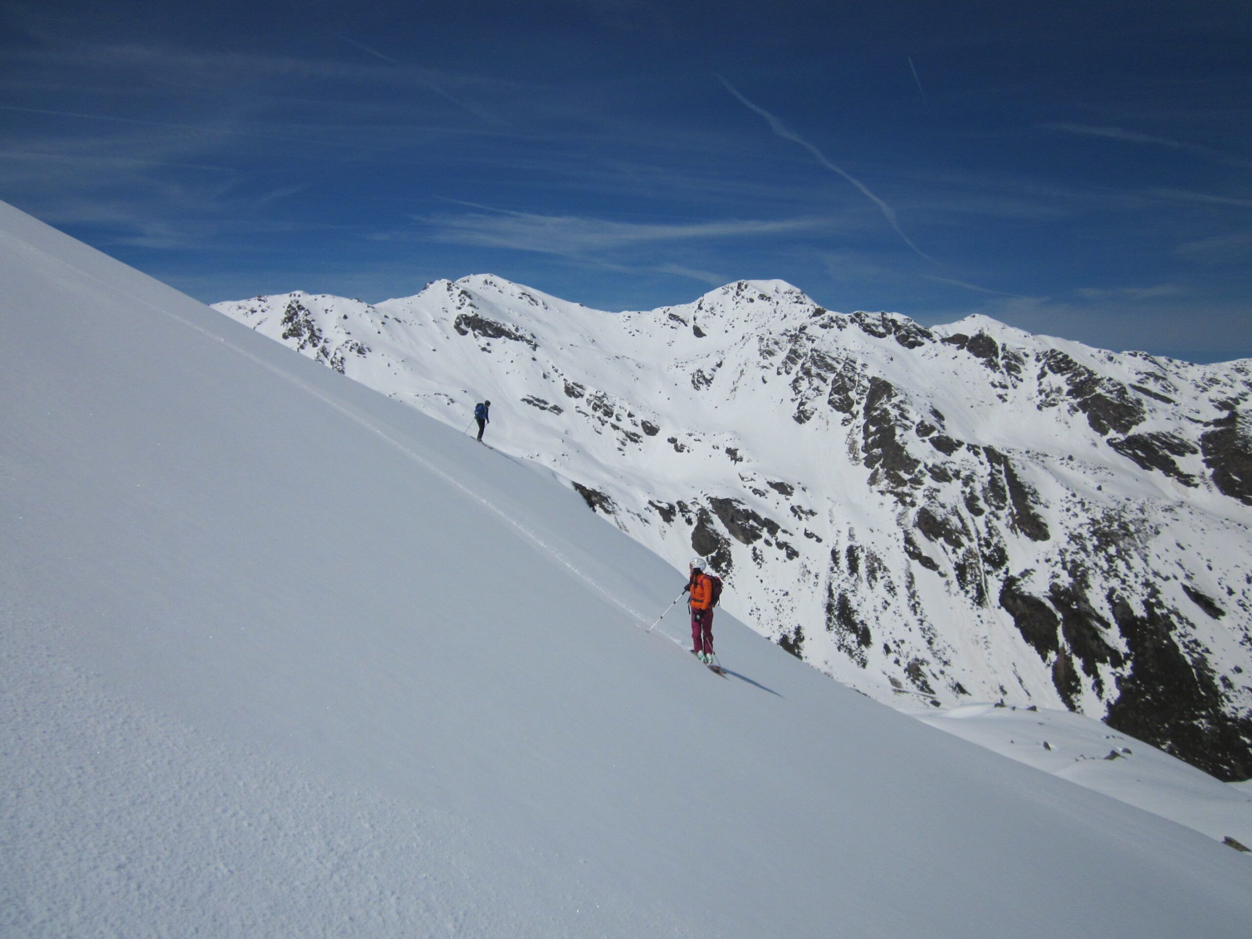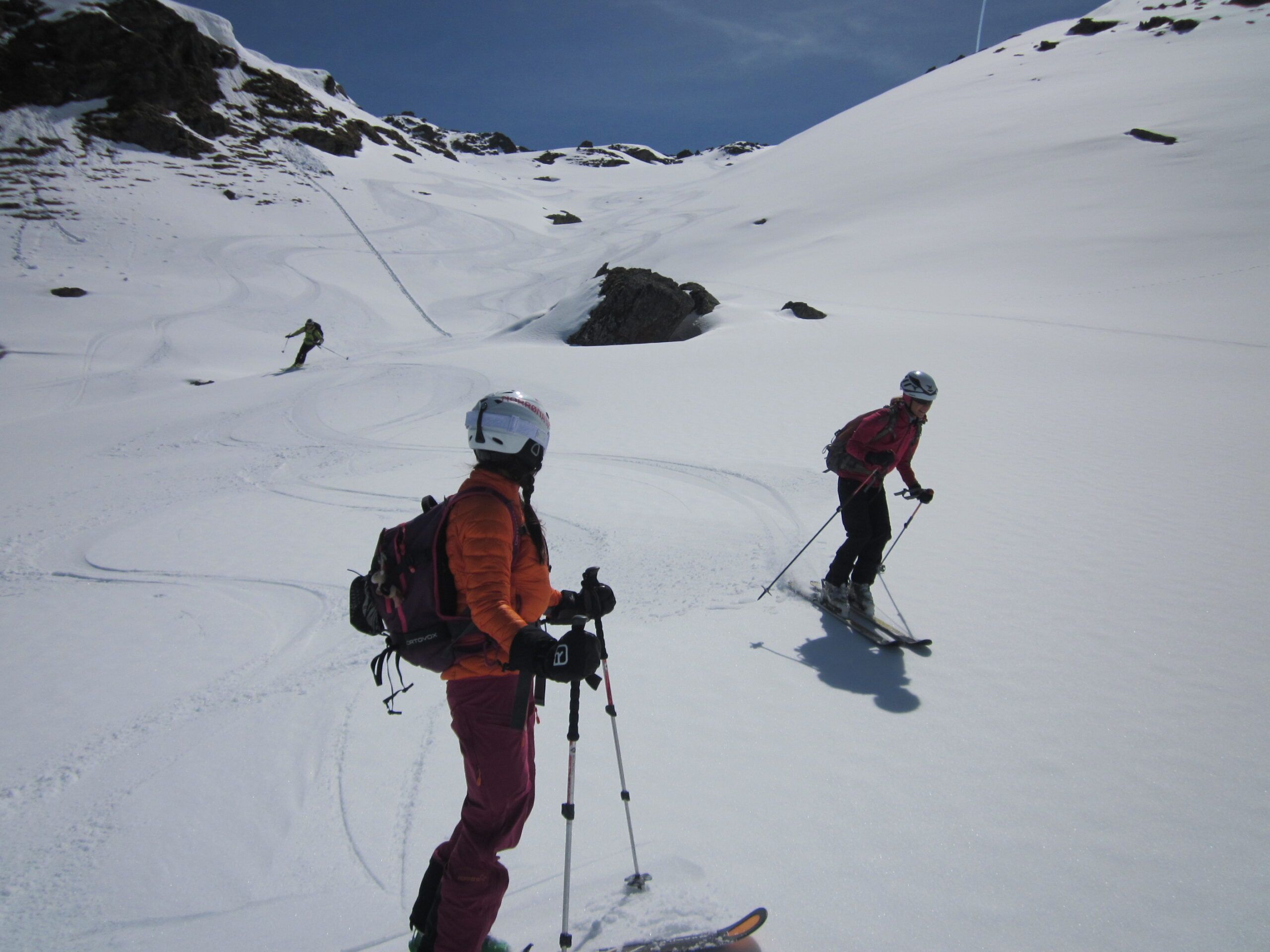 Nach dem Gipfelsieg auf der Seekaspitze wanderten wir dem Kamm entlang weiter zur Eisenkarspitze und auf einen weiteren, unbenannten Gipfel, vom dem wir die traumhafte Firnabfahrt in den Talboden antraten.