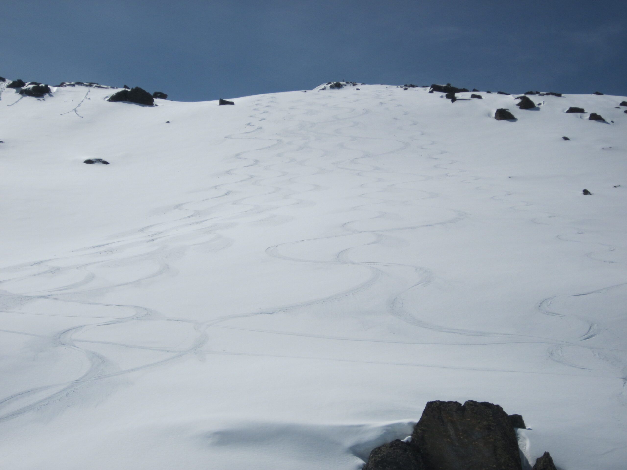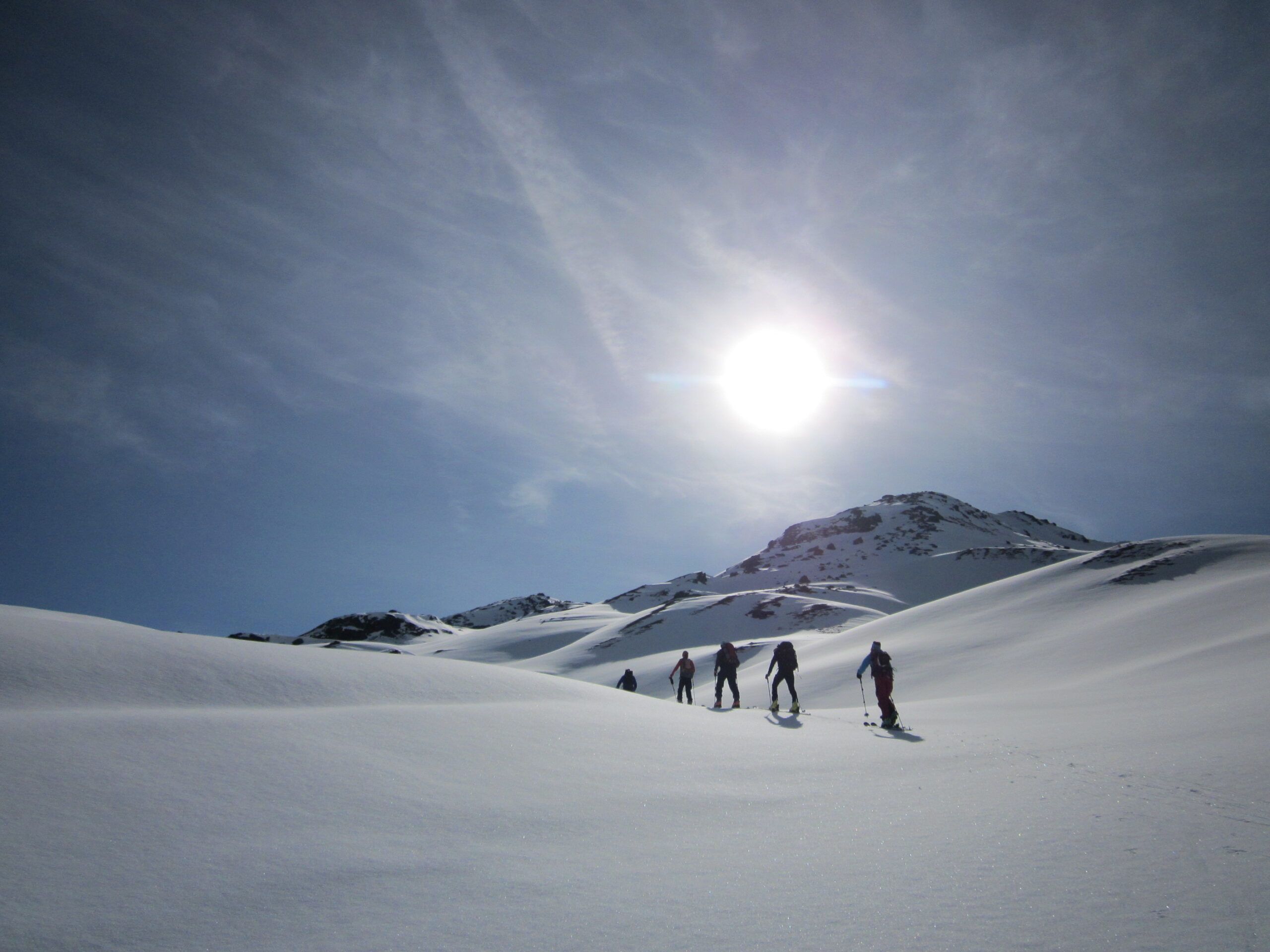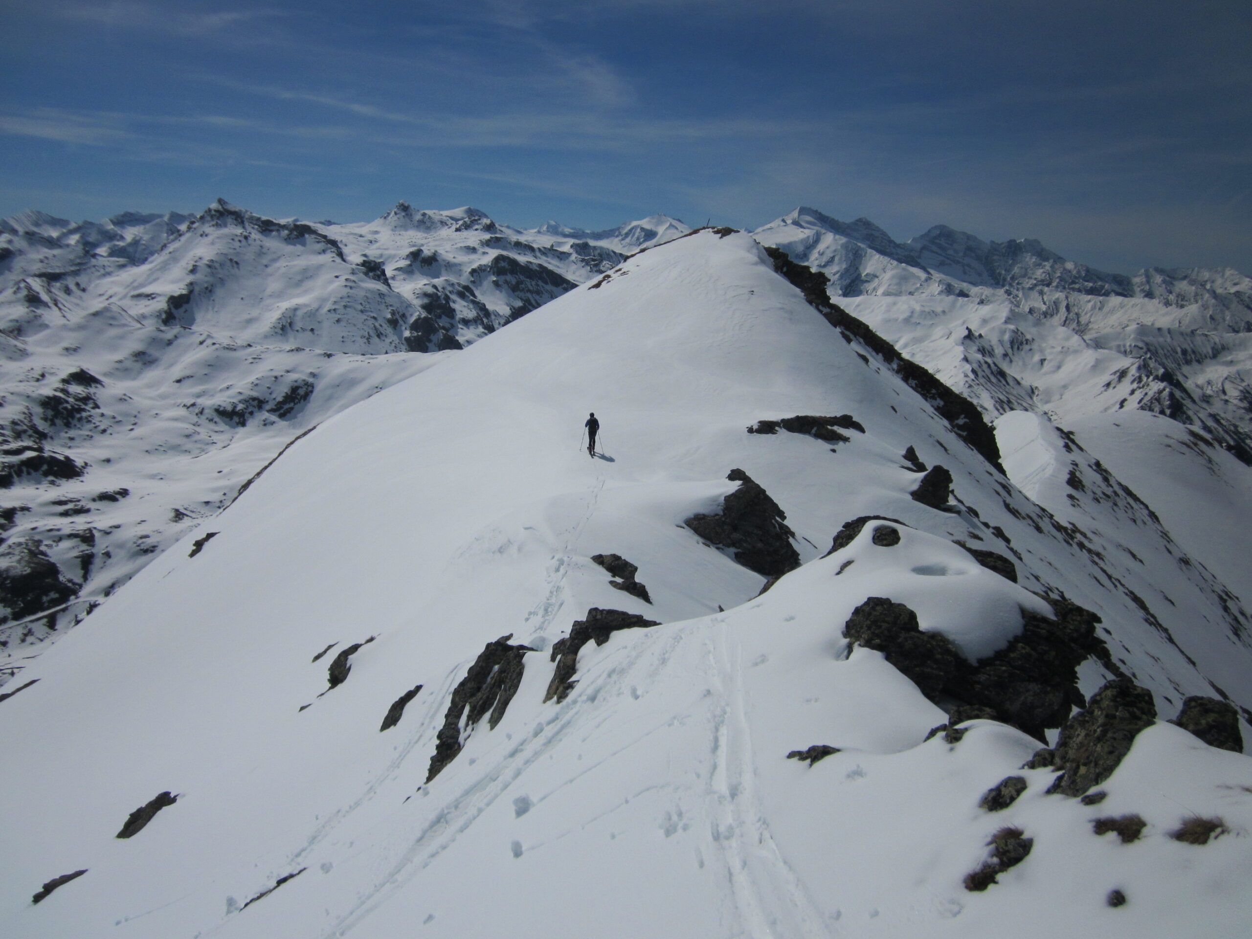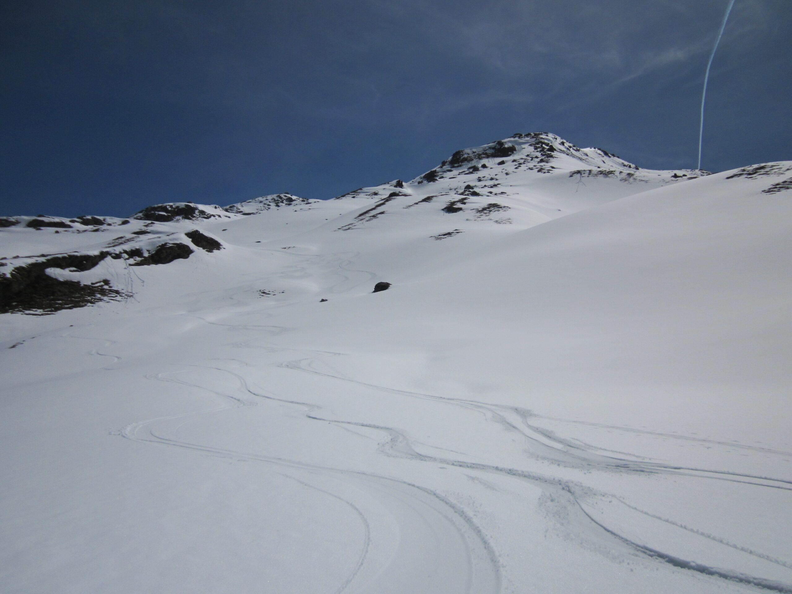 Nach dem Gipfelsieg auf der Seekaspitze wanderten wir dem Kamm entlang weiter zur Eisenkarspitze und auf einen weiteren, unbenannten Gipfel, vom dem wir die traumhafte Firnabfahrt in den Talboden antraten.