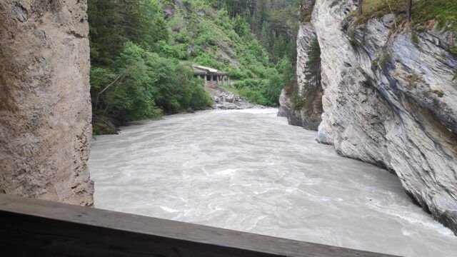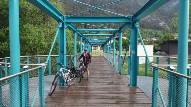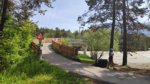 Gleich über die (relativ neue) Radbrücke auf die flussaufwärts gesehen linke Seite des Inn. Fein pedalieren wir dem Inn entlang bis zur Kajetansbrücke, an der wir wieder den Inn auf die rechte Seite queren. Jetzt bereits Richtung Schweizer Grenze hoch bis Hochfinstermünz. Um diesen Punkt zu erhaschen müssen wir von Höhe der Bundesstraße wieder knappe 100 Höhenmeter nach unten zum Inn.