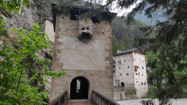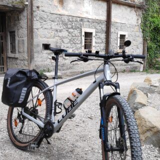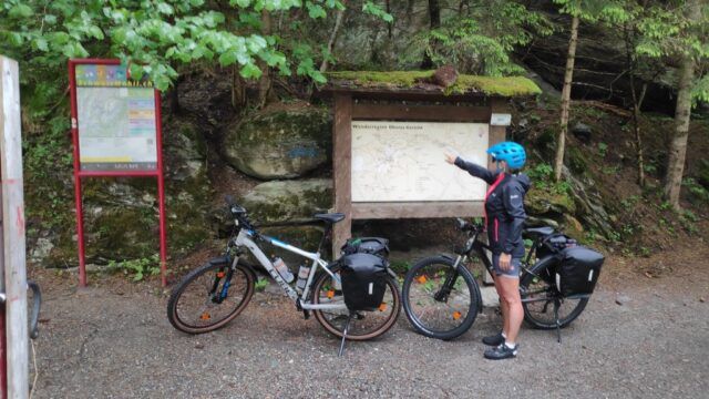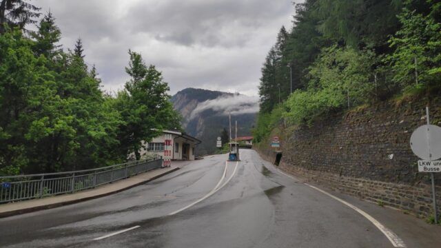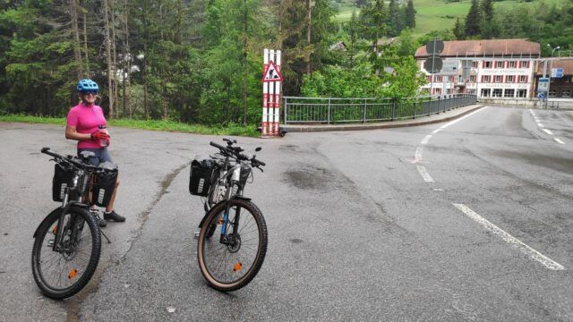 Hochfinstermünz, wir haben es gesehen, kann man, muss man aber nicht, vor allem, wenn man sich den nächsten Abschnitt sparen möchte. Weniger ideal ist, dass wir jetzt mit unseren vollgepackten Bikes wieder nach oben zur Bundesstraße müssen. 100 Höhenmeter über einen steilen Stich, der dann die letzten Meter, auf Grund unserer schweren Ausrüstung, nicht mehr fahrbar ist. Auf der Höhe der Bundesstraße angekommen, nach dieser Anstrengung, jetzt mit leichtem Grinsen im Gesicht. Die nächsten Höhenmeter sind rasch erledigt bis es endlich wieder talwärts zur Schweizer Grenze – bei Martina – geht.