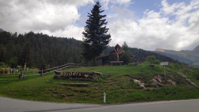 Auf der Norbertshöhe machen wir kurz Rast und nehmen Riegel und Getränk auf. Die Regenjacken werden wieder adjustiert geht es doch ca. 100 Höhenmeter hinunter nach Nauders. Dort fädeln wir wieder auf den Radweg ein und treten uns die Waden zum Reschensee hoch, wieder warm.
