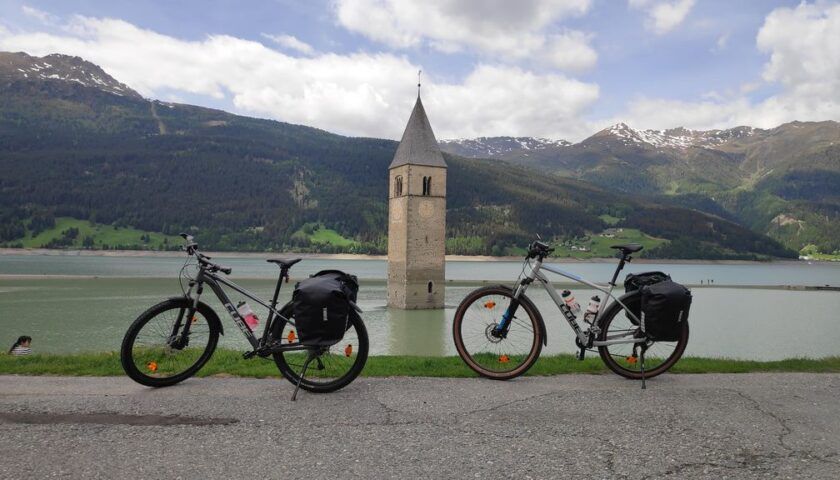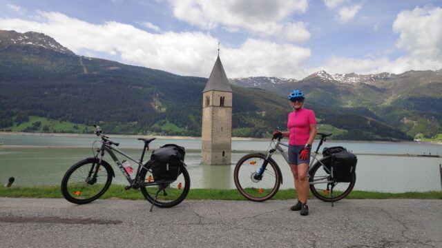 Wir „umradeln“ den Reschensee auf der östlichen Uferseite und wechseln beim Heidersee zur Abwechslung auf die westliche Uferseite. Hier ist der Radweg recht abwechslungsreich. Für Rennradreifen absolut ungeeignet an diesem Abschnitt. Hier bewähren sich wieder unsere Hardtail MTB. Ab Burgeis wird es wieder Rennradtauglich. Diesen Abschnitt kenne ich bereits aus anderen Alpenüberquerungen bzw. Radreisen. Mittlerweile hat es wieder sommerliche Temperaturen und wir schwitzen uns einen ab. Mitten in den Apfelplantagen finden wir an einem Stadel ein schattiges Plätzchen an dem wir wieder Kraft tanken. Weiter bis Laatsch und dann nach Schlanders, weiter nach Laturns und schlussendlich in Partschins am Ziel angelangt. Im Hotel Botango checken wir ein – sehr zu empfehlen.