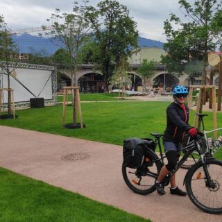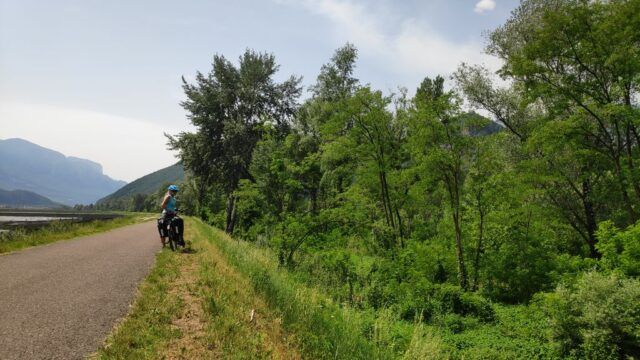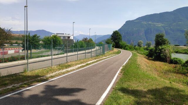 Wir nehmen Fahrt auf Richtung Meran. Dann etwas mühevoll den Radweg mitten durch das Zentrum von Meran hindurch, etwas umständlich aber geschafft. Es geht wieder auf „normalem“ Radwegterrain weiter. Recht kurzweilig geht es raus bis Bozen. Hier biegen wir der A22 entlang auf den Radweg Richtung Auer.