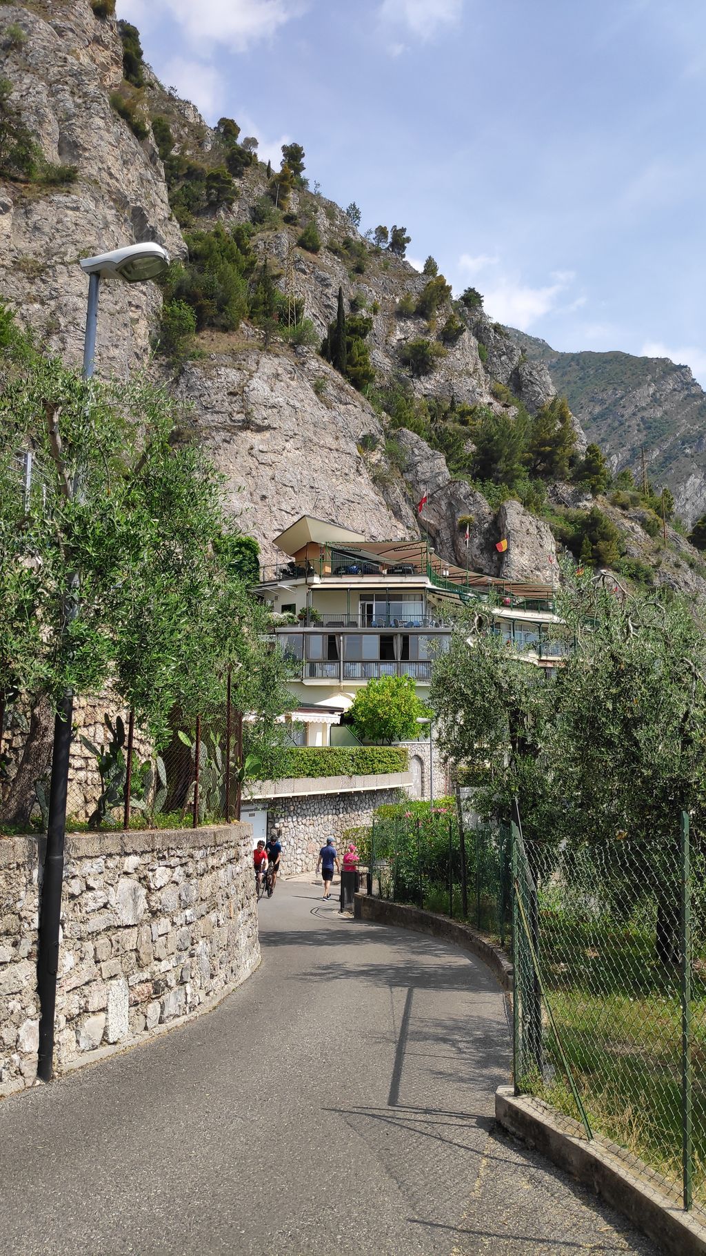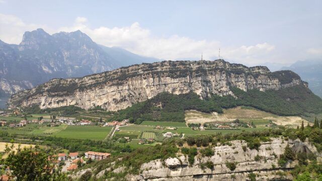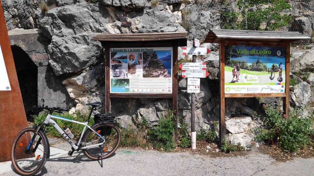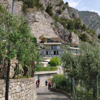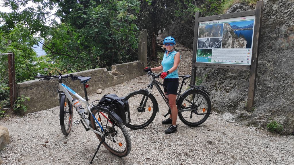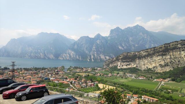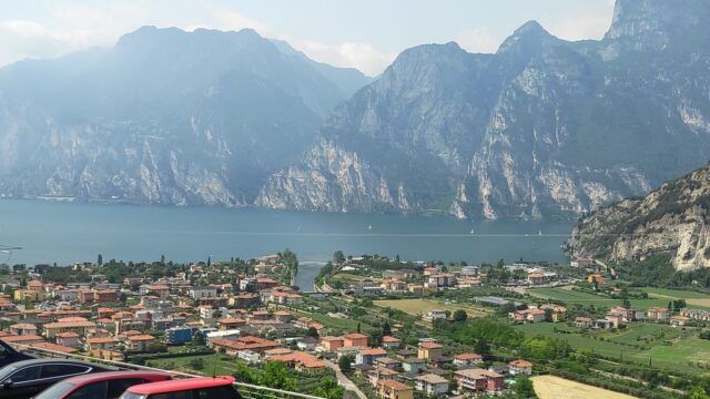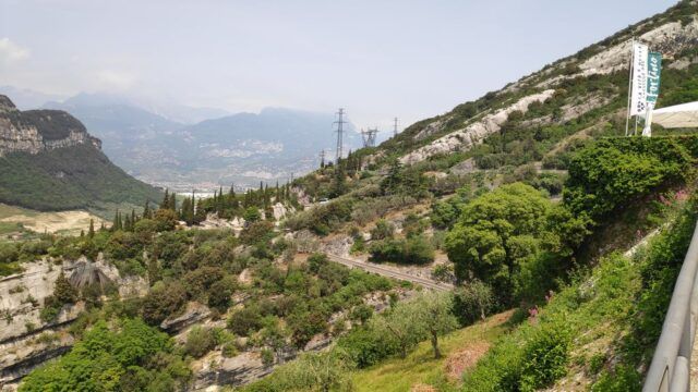 Der Anstieg über Mori und weiter bis Loppio, dort durch den Tunnel und weiter Richtung Nago. Vor Nago müssen wir nochmals die Zähne zusammen beissen, da eine Umleitung in ein extrem steiles Stück führt und wir mit dem kleinsten Gang unsere Packeselräder nach oben bringen. Geschafft! Nago mit dem erstem Blick auf den Gardasee ist erreicht.